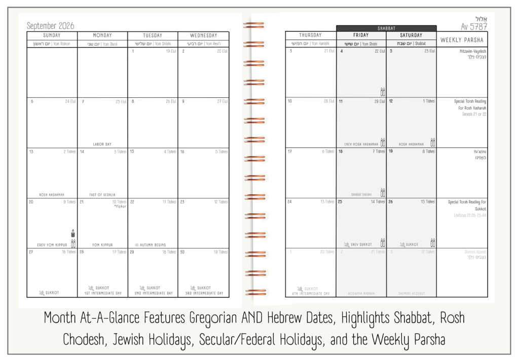 If you are Jewish, you know the pain points of living a “two-calendar life”. Gregorian lifestyle planners that mark all the federal and secular holidays, but don’t capture the fullness of the Jewish calendar. We have to keep two calendars…a “secular” calendar for appointments, vacations, school breaks, birthday tracking, and more, while keeping a Jewish calendar to reference for candlelighting times, holidays, yarzheits, Torah portions, and more. You’re constantly translating, calculating, writing Jewish life into margins that weren’t designed for it.