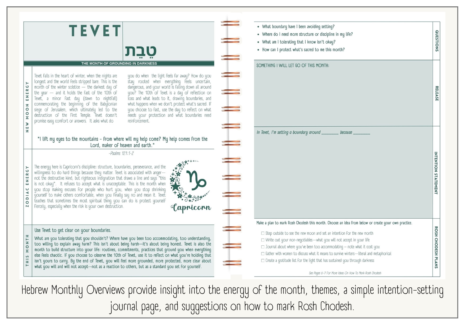 - Hebrew Month Overviews Each month begins with an overview of the Hebrew month’s attributes, helping you mark Rosh Chodesh (the new month/new moon) and understand the spiritual rhythm of the season—if that’s your practice. And if it isn’t, you might find inspiration to start.