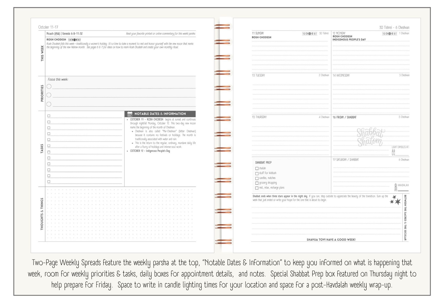 If you love lifestyle planners, but are tired of retrofitting them to Jewish life and holidays, this planner was made for YOU. The Copper Mirror Weekly Planner isn’t a Jewish product pretending to be a planner—it’s a real weekly planner that happens to be Jewish-centered. Get ready for the planner that makes being Jewish just a part of your everyday life — however you practice.