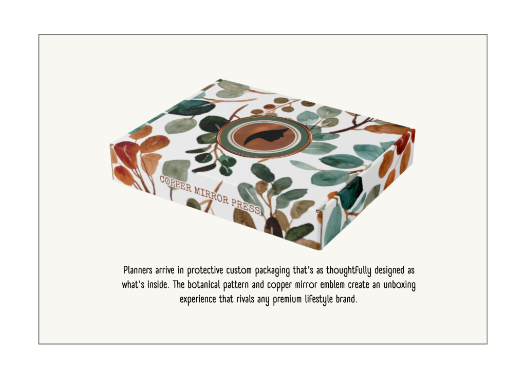 - Premium printing, binding, tissue paper, insert cards and other packaging so planner users get the same high-end experience provided by other lifestyle planner brands
