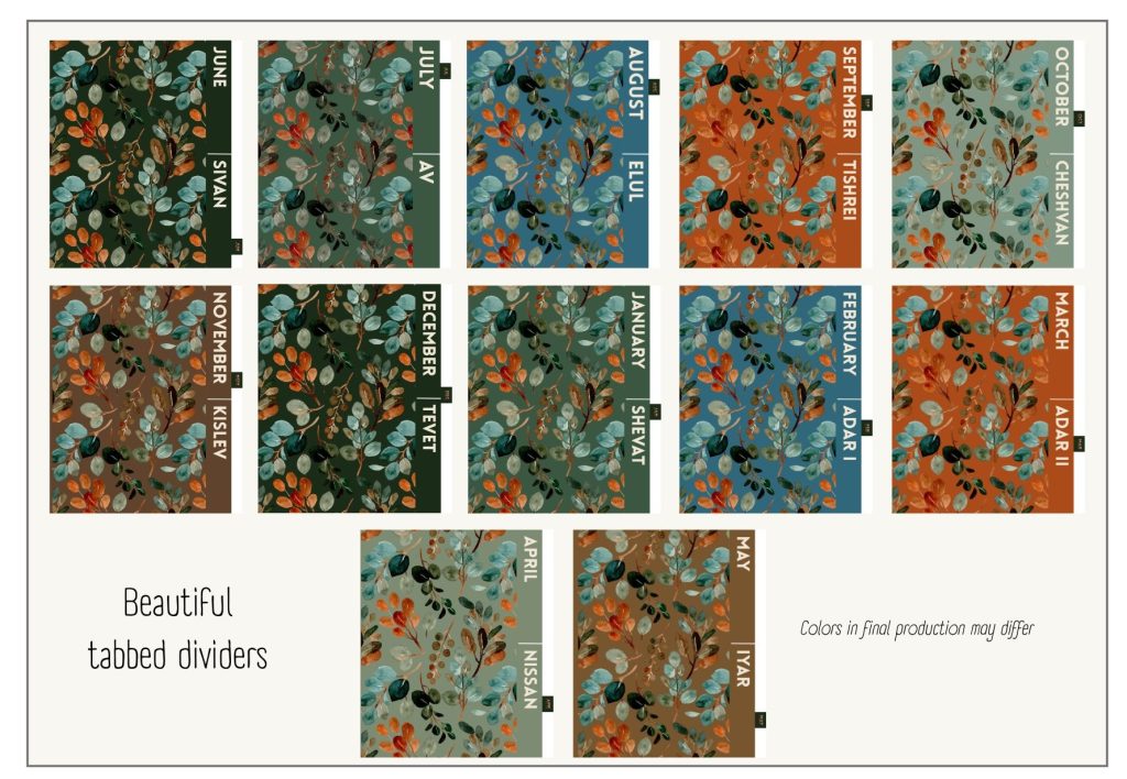 - Full-color printing for Hebrew month overviews and dividers